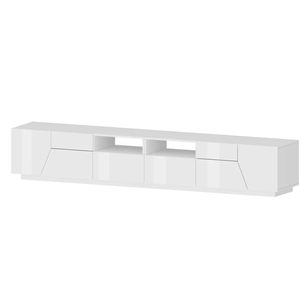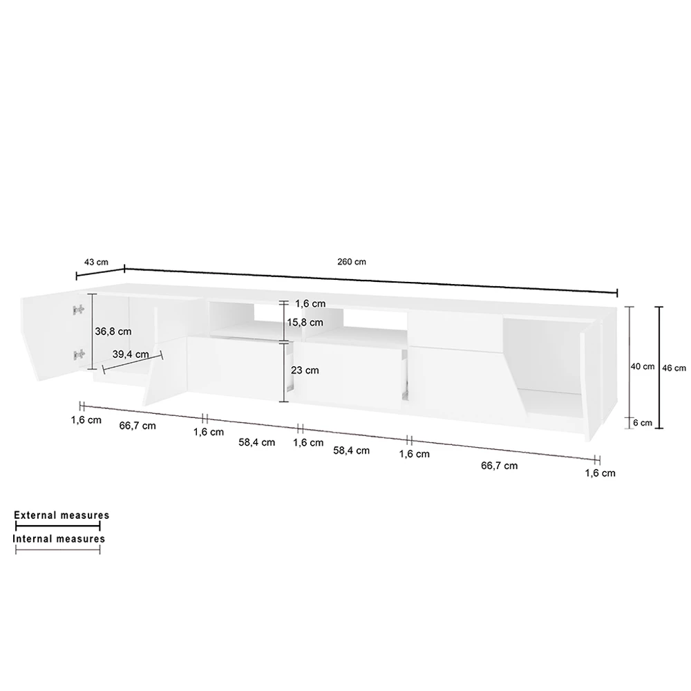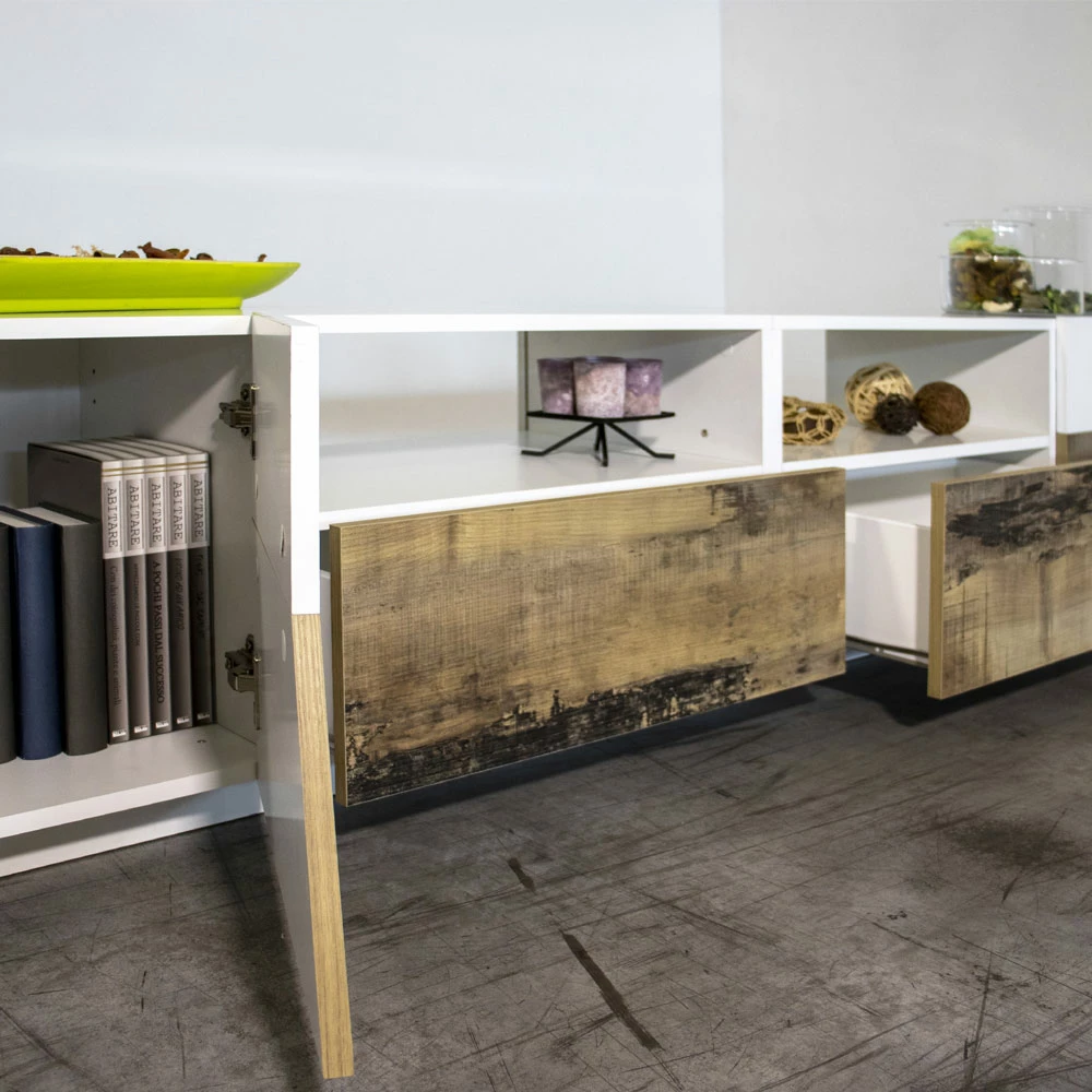 Moderne en elegante tv- kast volledig gemaakt in Italië met een structuur van gerecycled en ecologisch duurzaam melaminehout, ontworpen om de woonkamer op een eigentijdse en verfijnde manier in te richten. Bestaande uit een groot steunoppervlak dat handig is voor het opbergen van televisie- en multimedia-apparaten, 2 zijvakken met scharnierende opening, 2 schuifladen en 2 centrale open vakken , dit tv-meubel is in staat om een prachtig centraal punt in de woonkamer te creëren waardoor het woongedeelte netter en lichter wordt.