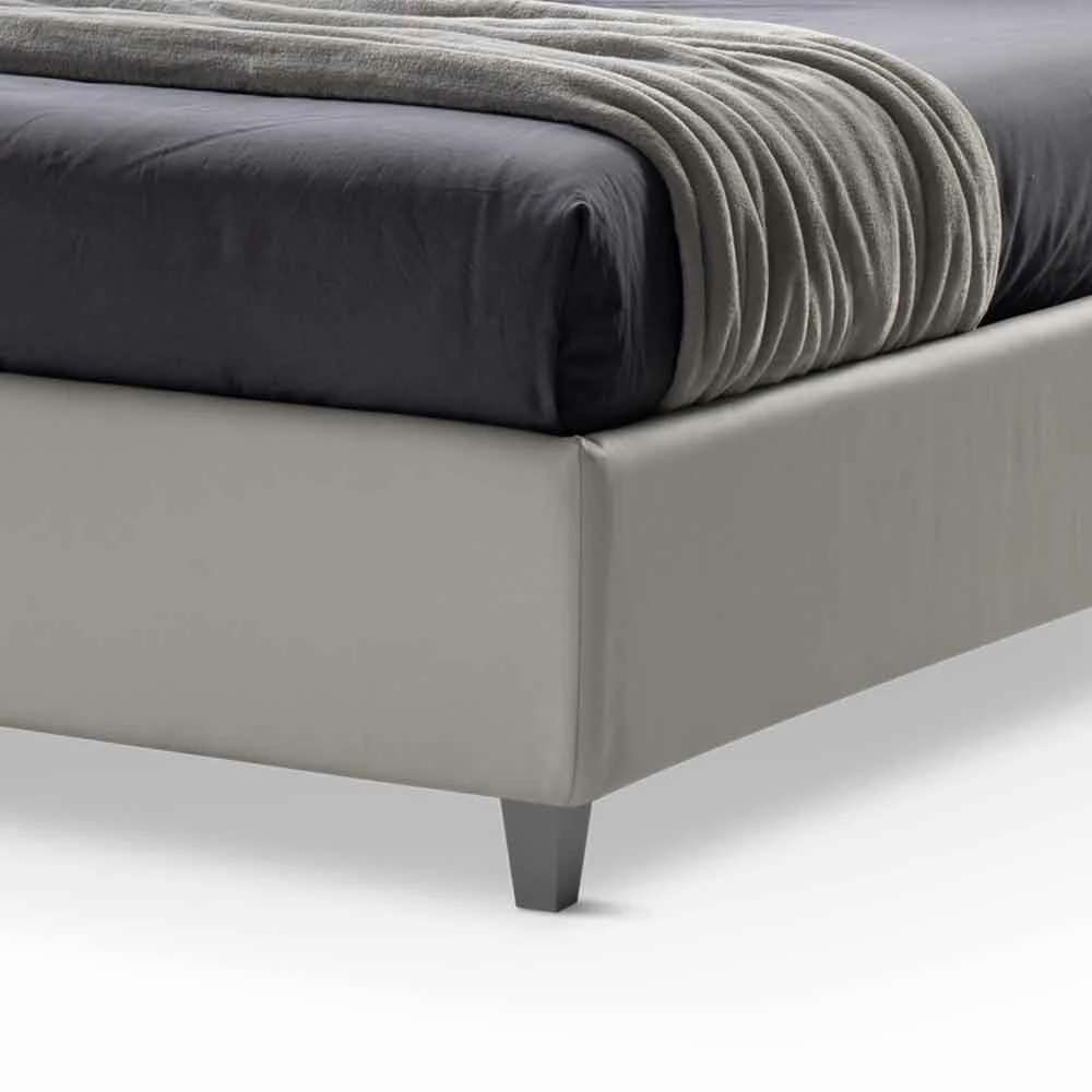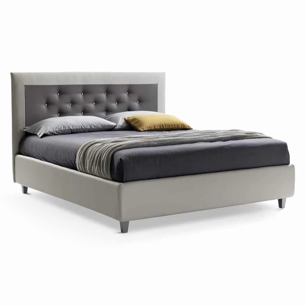 Hoogwaardig tweepersoonsbed met opberger en hoofdeinde met tweekleurige eco-leren knopen, made in Italy.
