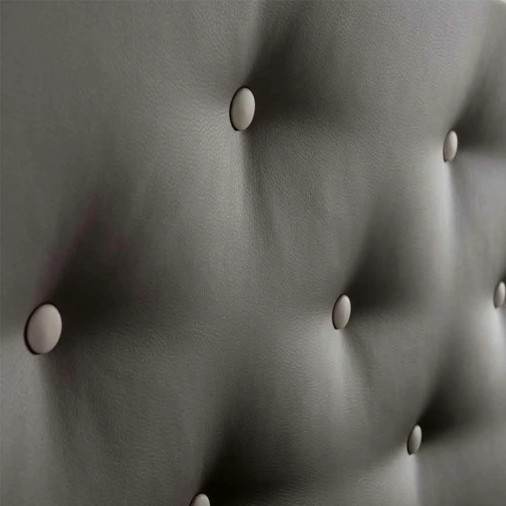 Het gecapitonneerde hoofdbord is versierd met knopen en wordt gekenmerkt door het tweekleurige frame-effect; het is niet verwijderbaar. Het bedframe is afneembaar.
