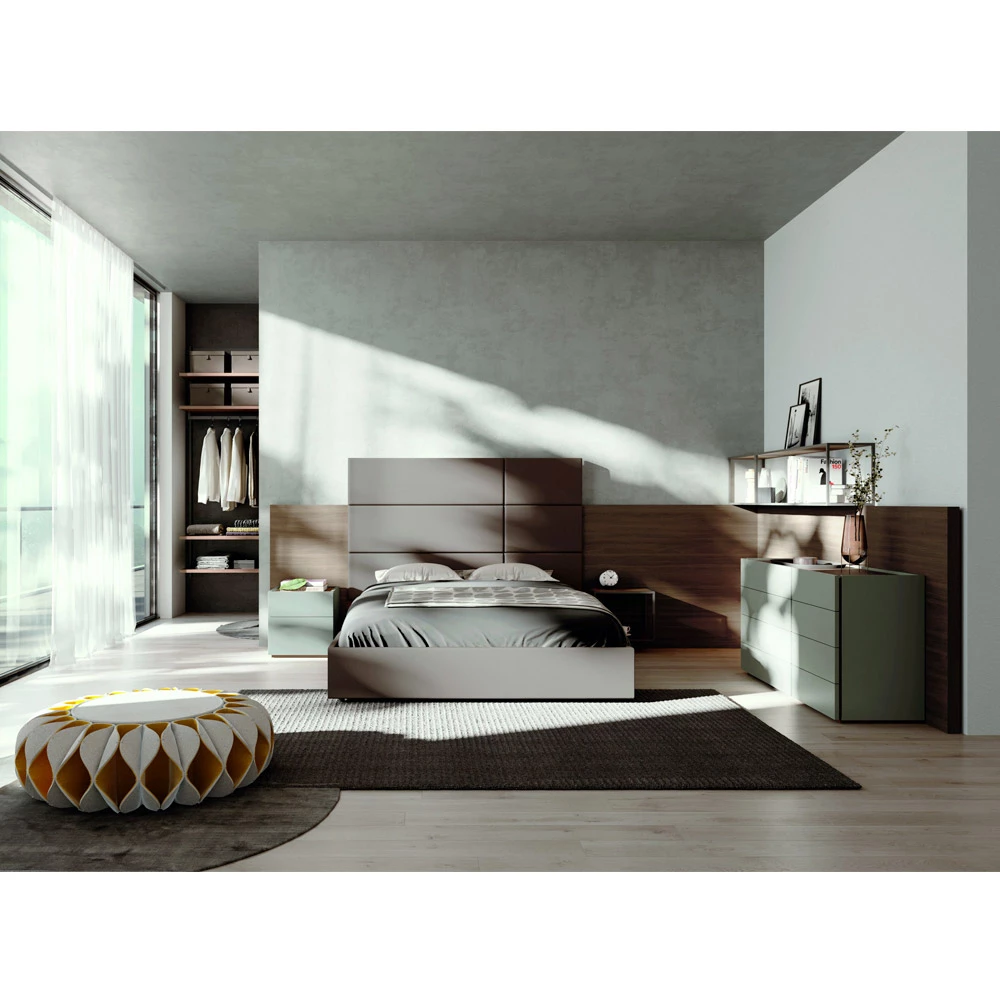 Slaapkamermeubel bestaande uit 5 elementen volledig gemaakt in Italië . De samenstelling omvat een tweepersoonsbed met gewatteerd bedframe bedekt met eco-leer en een hoofdeinde gemaakt van 6 houten panelen met een afwerking van terracotta materiaal, ook bedekt met eco-leer, een nachtkastje, twee bovenkasten en een ladekast met 8 lades in mat gelakt hout met titanium afwerking met details. van terracotta materiaal. Een oplossing voor de inrichting van het slaapgedeelte met een essentieel ontwerp dat wordt gekenmerkt door een verfijnde sfeer waarin u het plezier kunt herontdekken om uw slaapkamer volledig te leven in naam van comfort , functionaliteit en elegantie . Een bed, de hoofdrolspeler van de kamer, met comfort en exclusieve esthetiek aangevuld met elementen die kunnen worden ingericht terwijl ze de functie van insluiting vervullen voor een persoonlijk resultaat dat zal getuigen van een eigentijdse smaak .