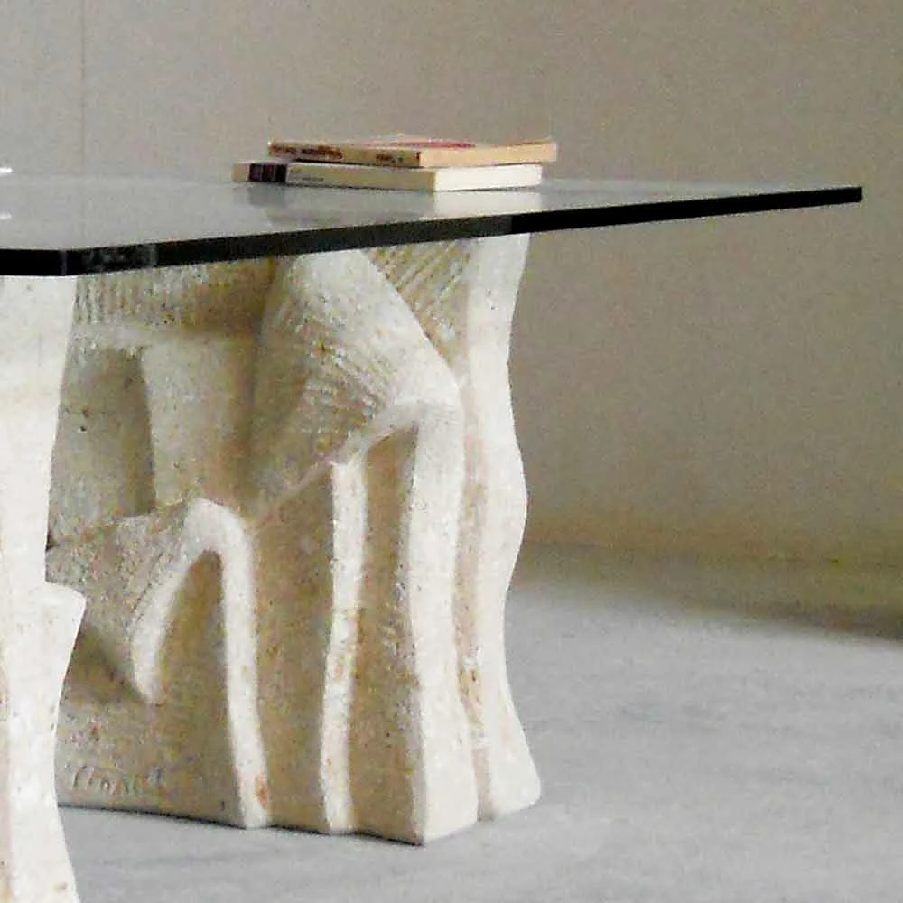 Moderne rechthoekige salontafel Gemaakt in Italië met dubbele basis in natuurlijke Vicenza steen, met de hand gesneden uit het massieve blok en met een 12 cm dikke floatglas top, rustend op de basissen.