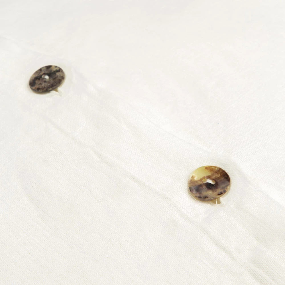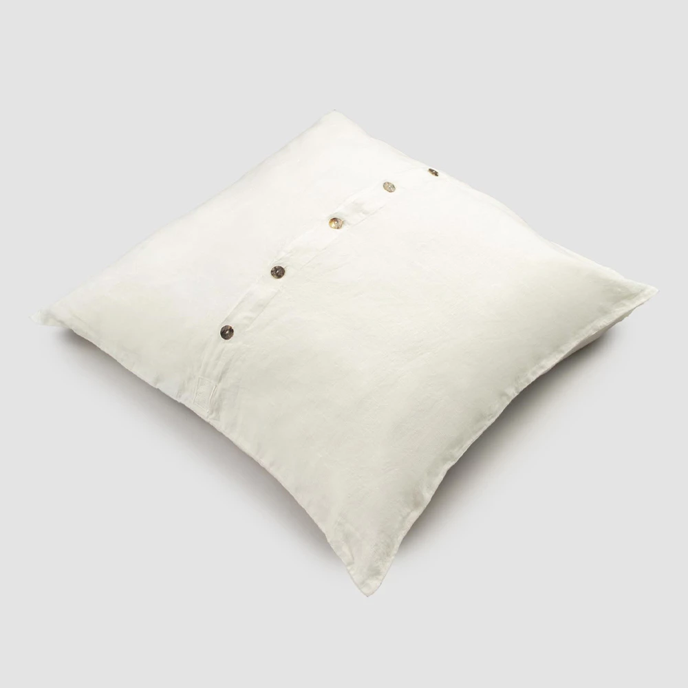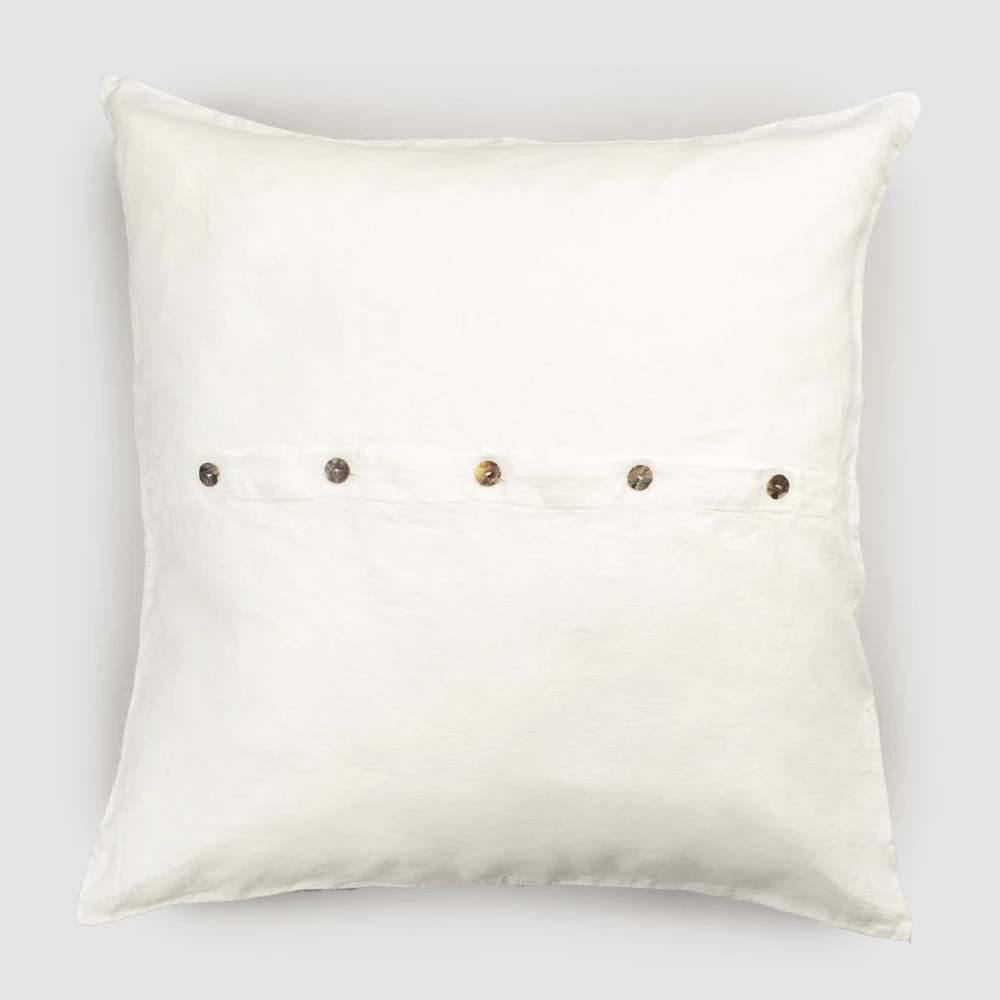 De waarde van traditie voegt zich bij de moderne levensstijl met deze zware linnen kussensloop met centrale sluiting met Agoya-knopen in parelmoer, voor decoratieve kussens met een vierkant design.
