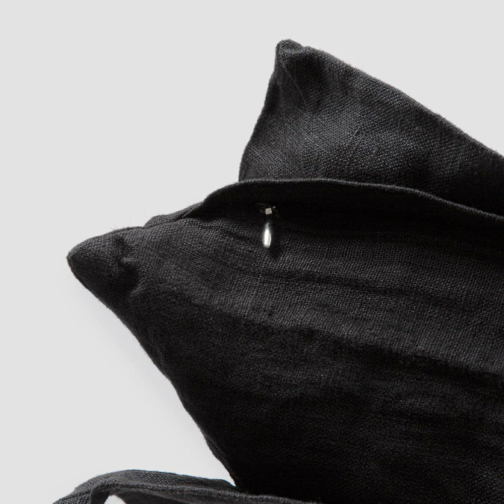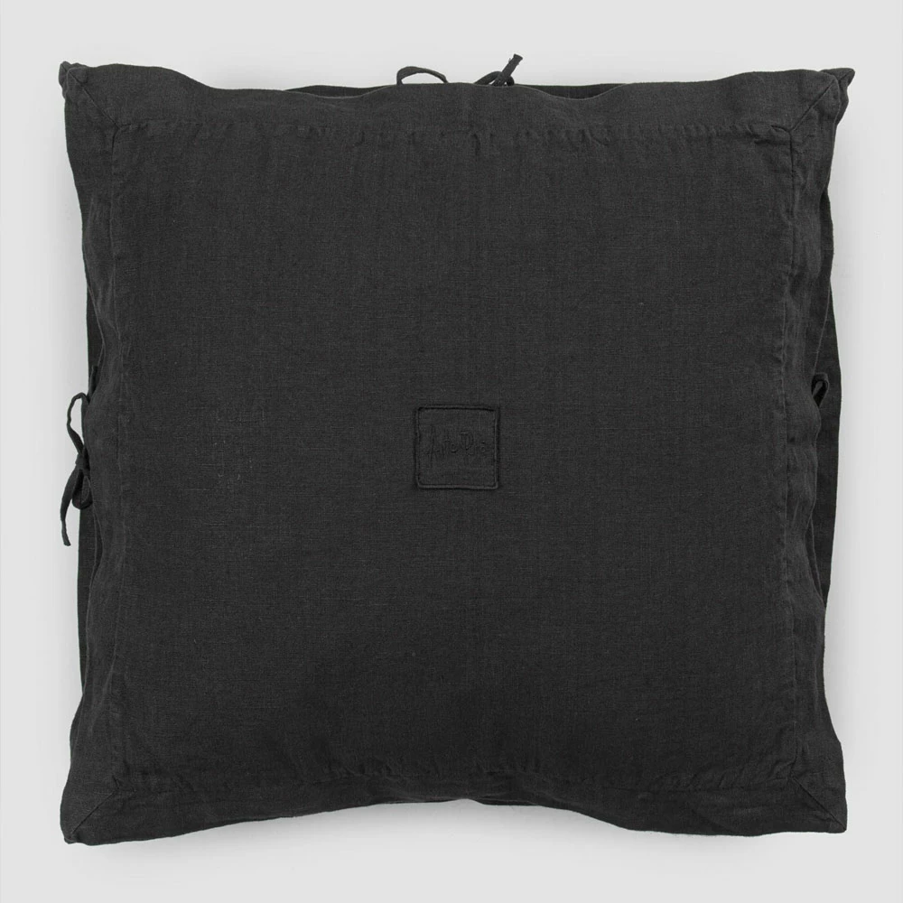 De waarde van traditie voegt zich bij de moderne levensstijl met deze zwarte zware linnen kussensloop met vierkante decoratie en banden aan de zijkanten.