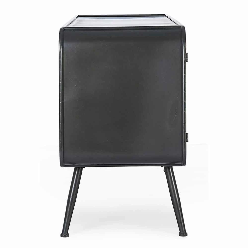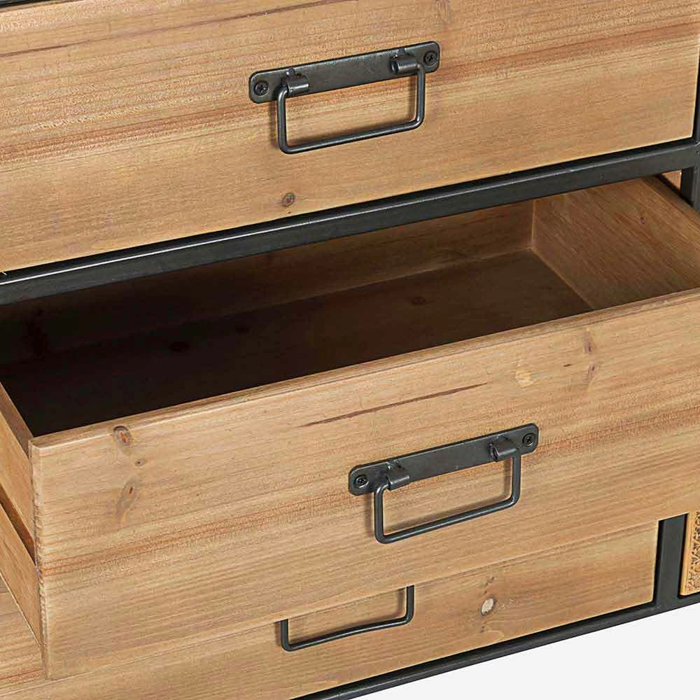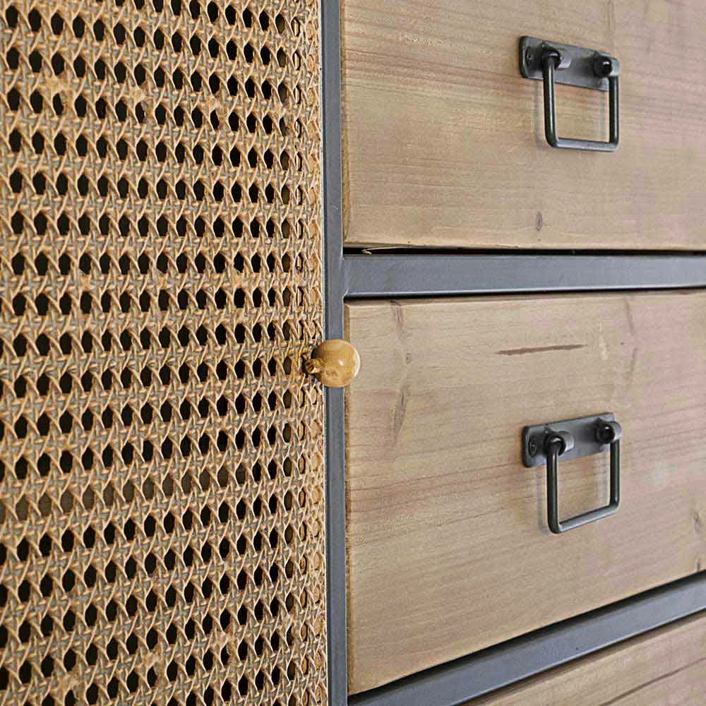 Stalen dressoir met deuren in rotan-effect en houten lades in vintage stijl.