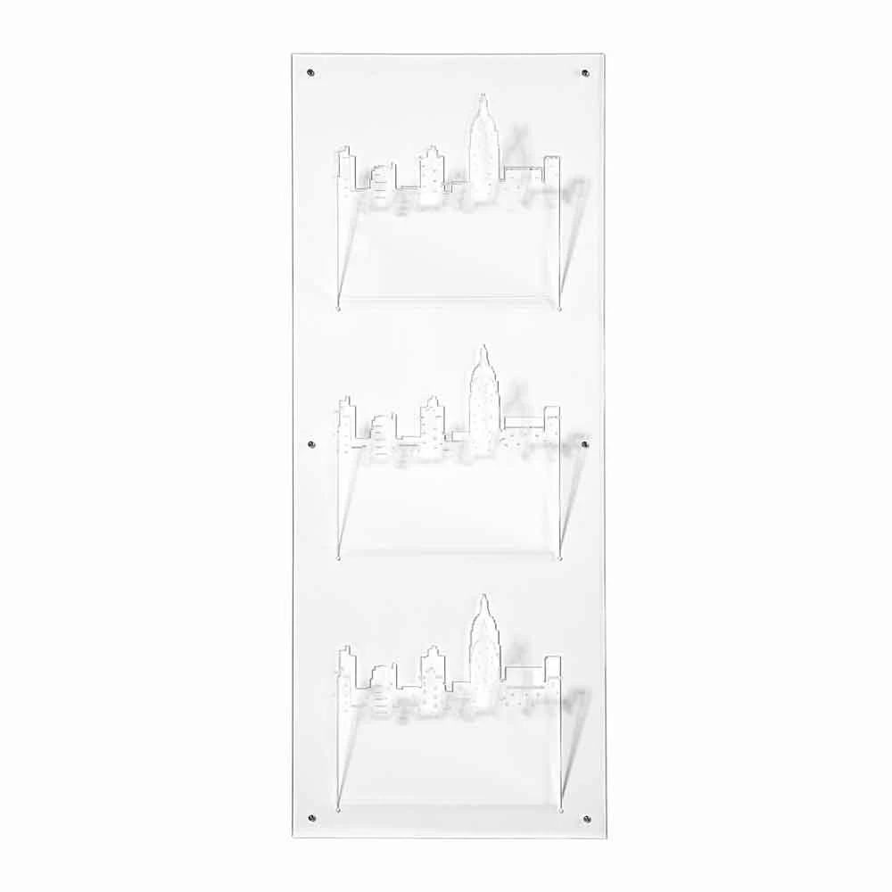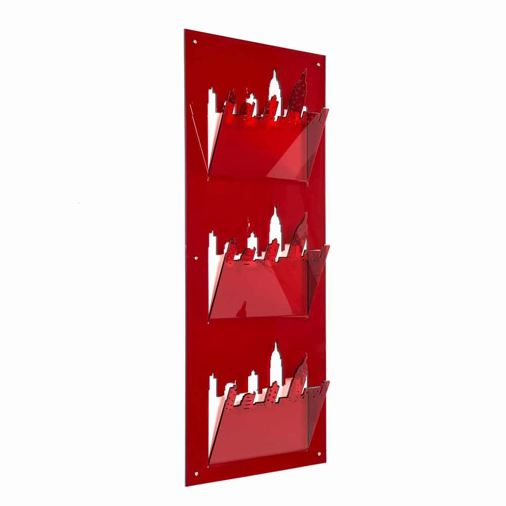 Wandmagazijnrek met drie compartimenten in modern, transparant, gerookt of rood plexiglas, handgemaakt in Italië.
