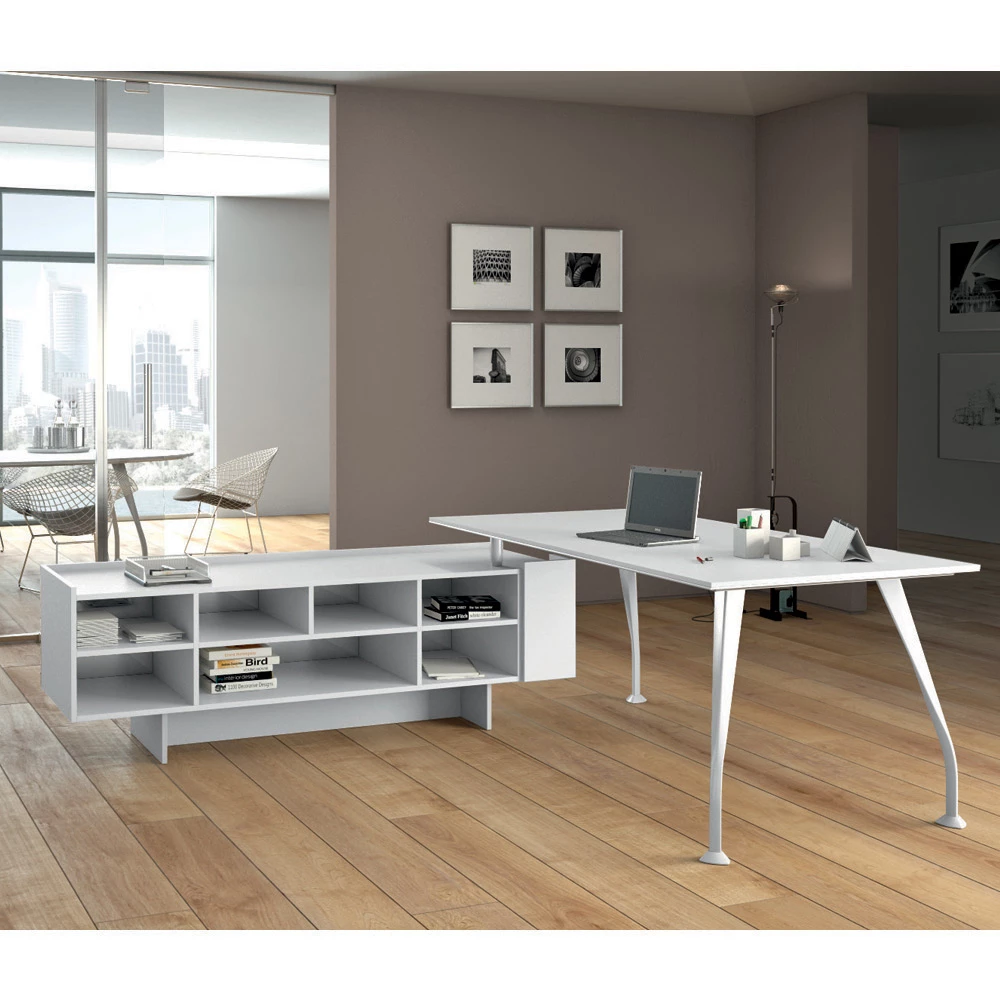 De eigenaardigheid van dit bureau ligt in het geïntegreerde open service-element, gemaakt van melamine met een witte afwerking.