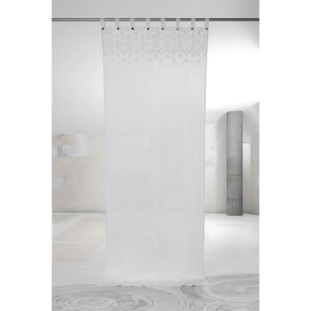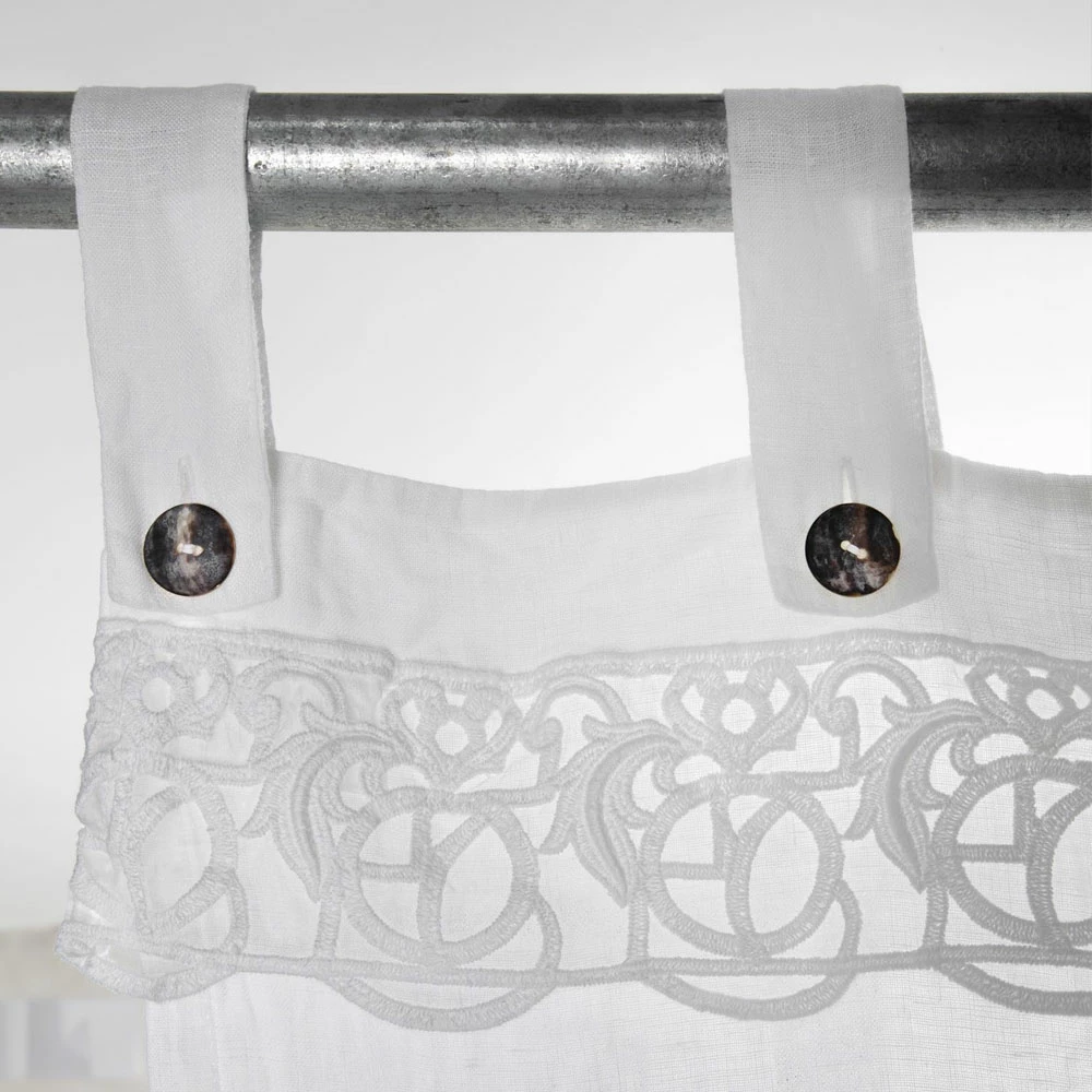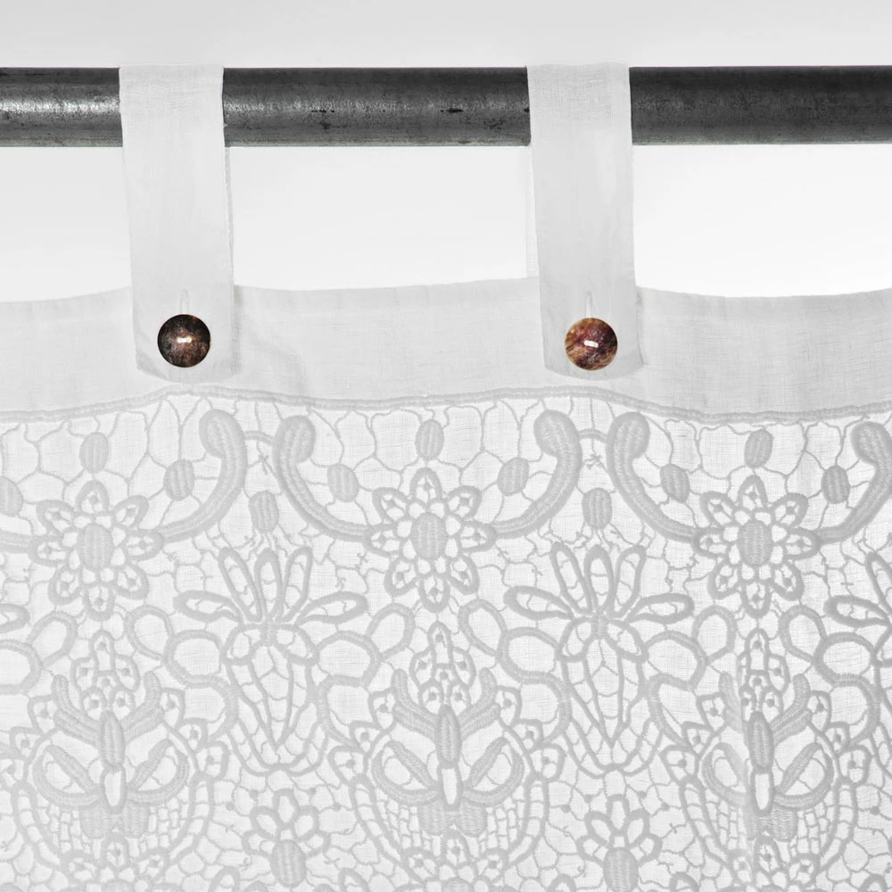 Wit licht linnen gordijn met kant voor staaf met parelmoer knopen, handgemaakte kwaliteit made in Italy.