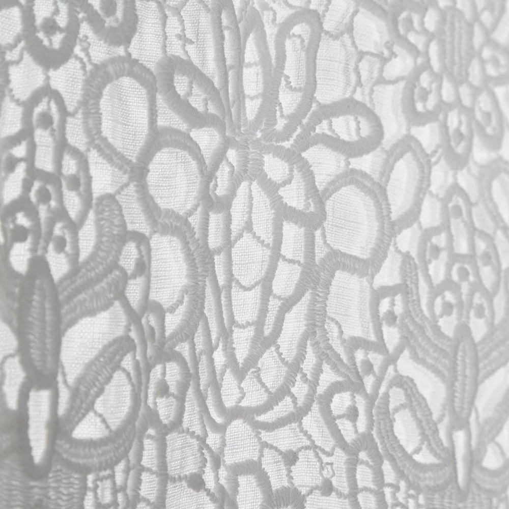 De waarde van traditie wordt gecombineerd met de moderne levensstijl in dit witte, lichte linnen gordijn met horizontaal kant bovenaan onder de vetersluiting gemaakt met Agoya-knopen in parelmoer.