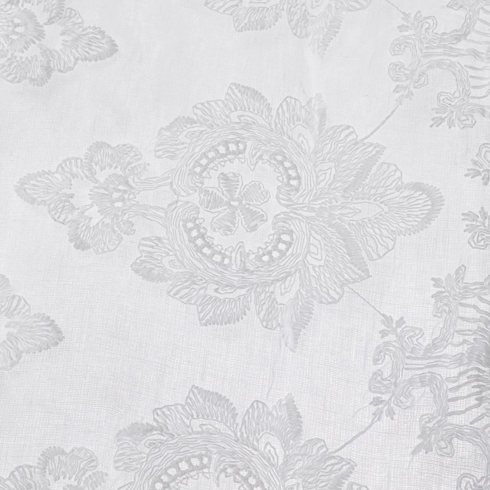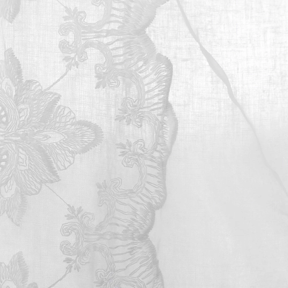 De waarde van traditie wordt gecombineerd met de moderne levensstijl in dit lichtwitte linnen gordijn met organza en verticaal borduurwerk in het midden en aanleg voor roede aan de bovenkant.