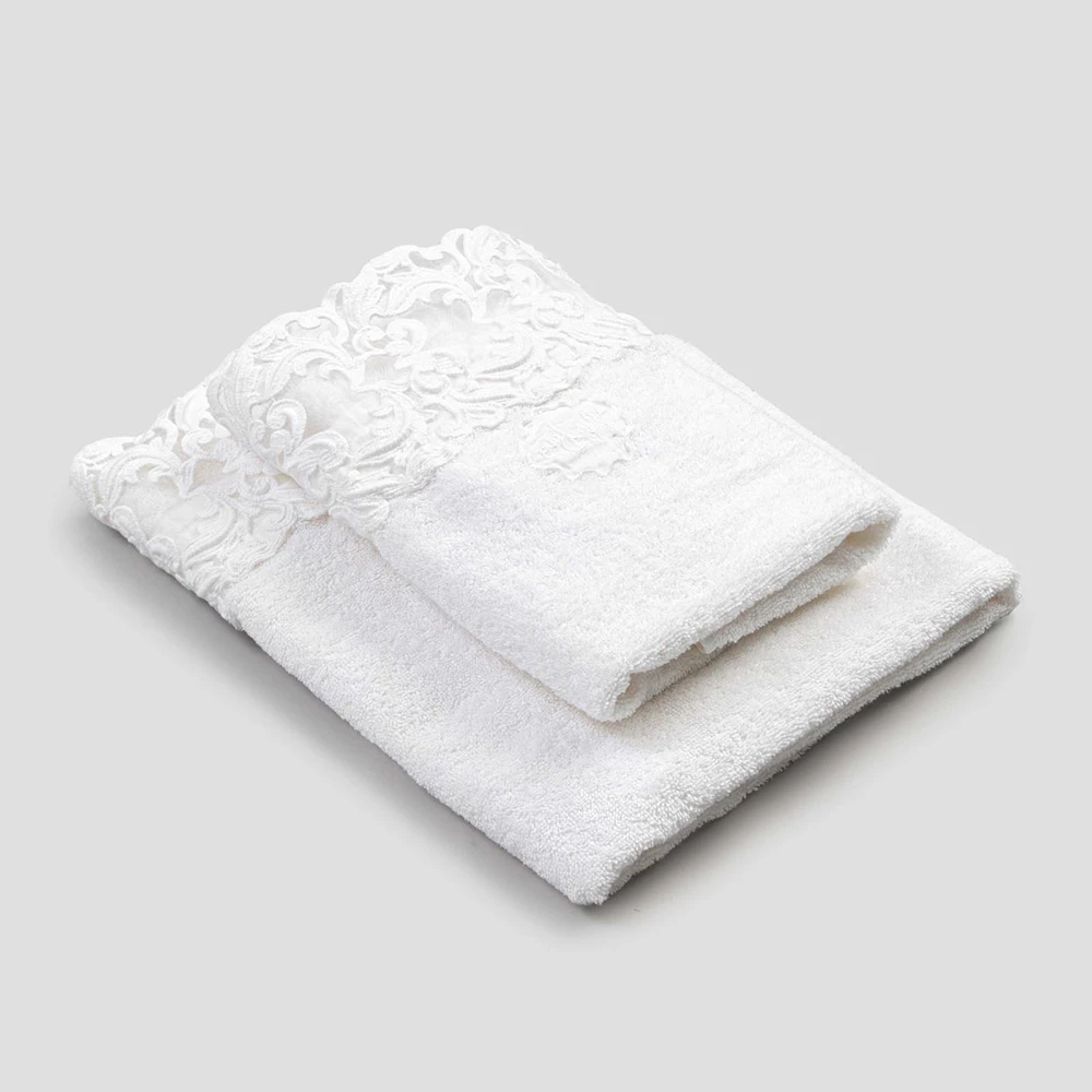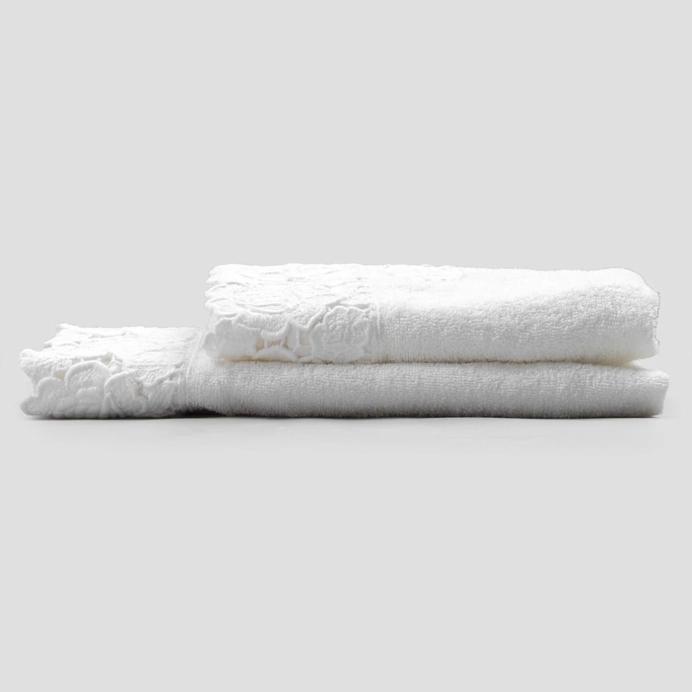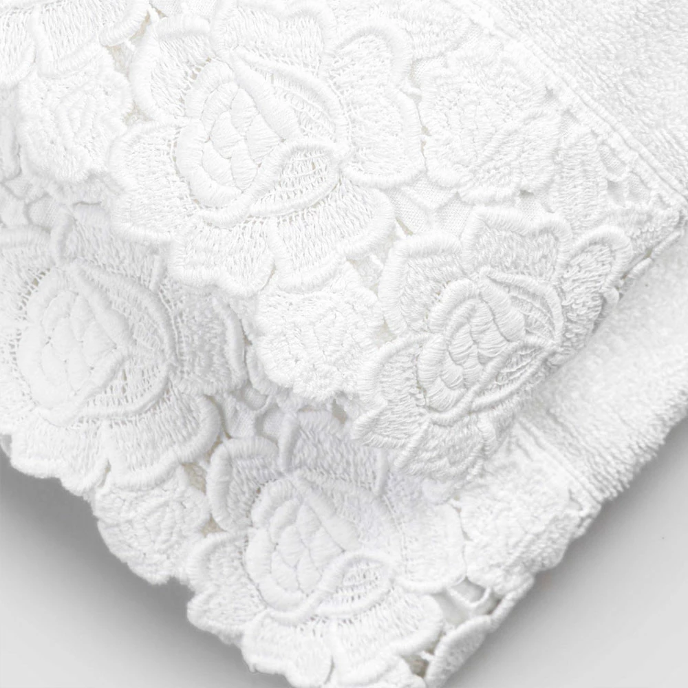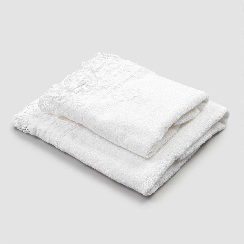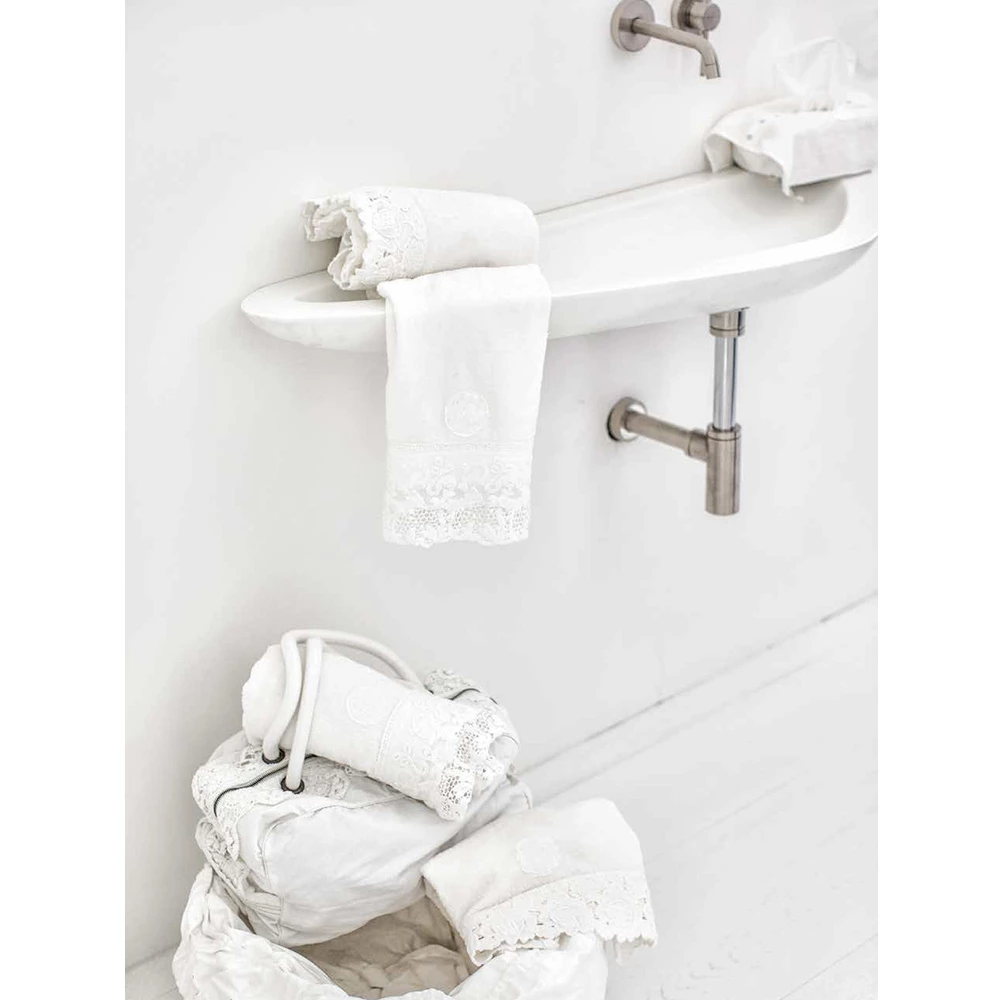 De waarde van traditie wordt gecombineerd met de moderne levensstijl in dit paar witte gezichts- en gastendoekjes van witte katoenen badstof met farnese, tule of met rozenkant aan één kant en een rand van linnenmix .