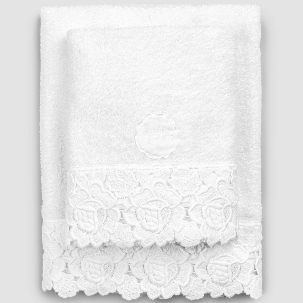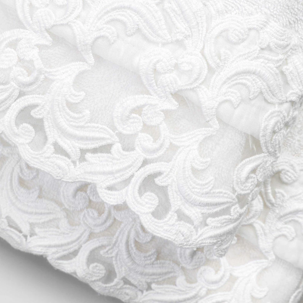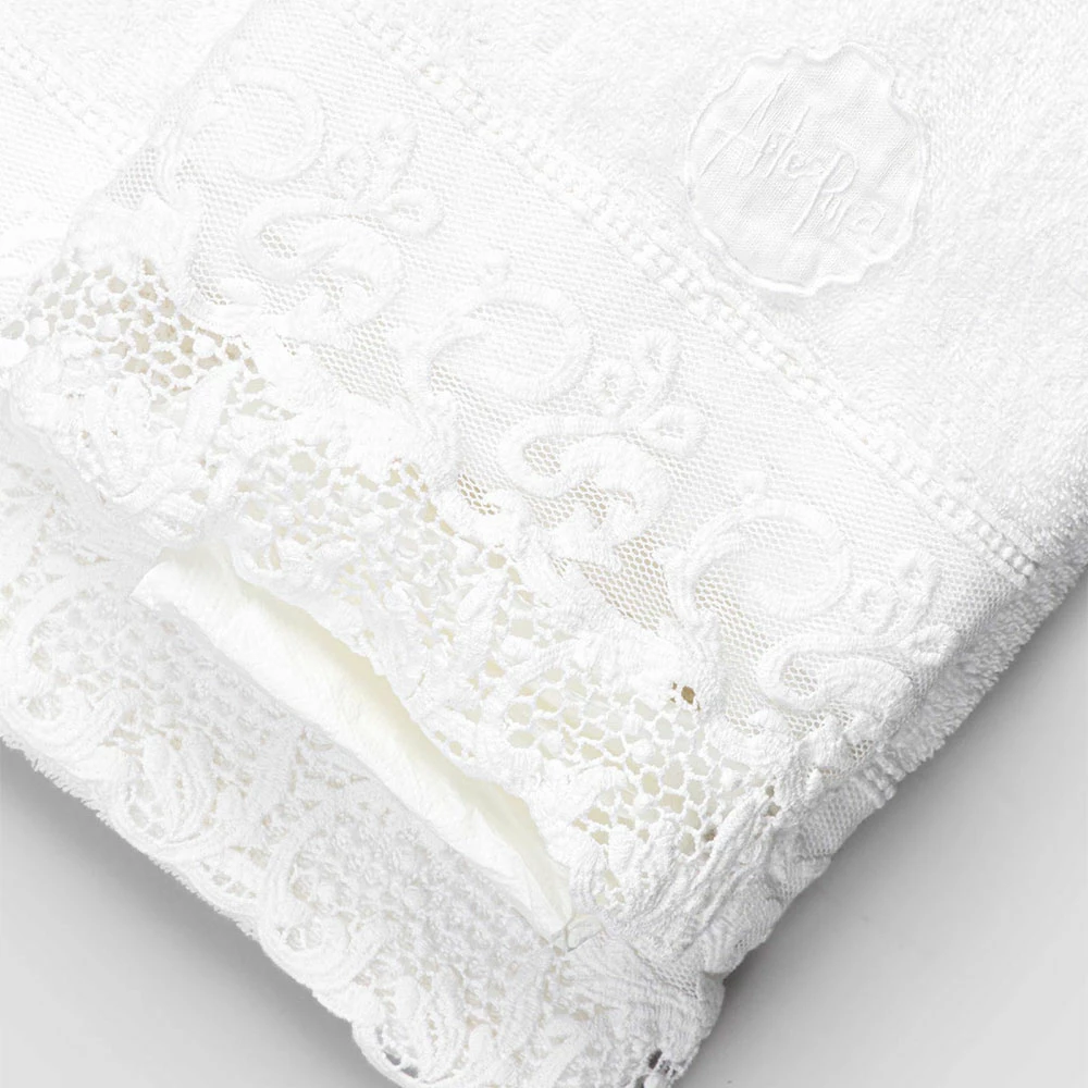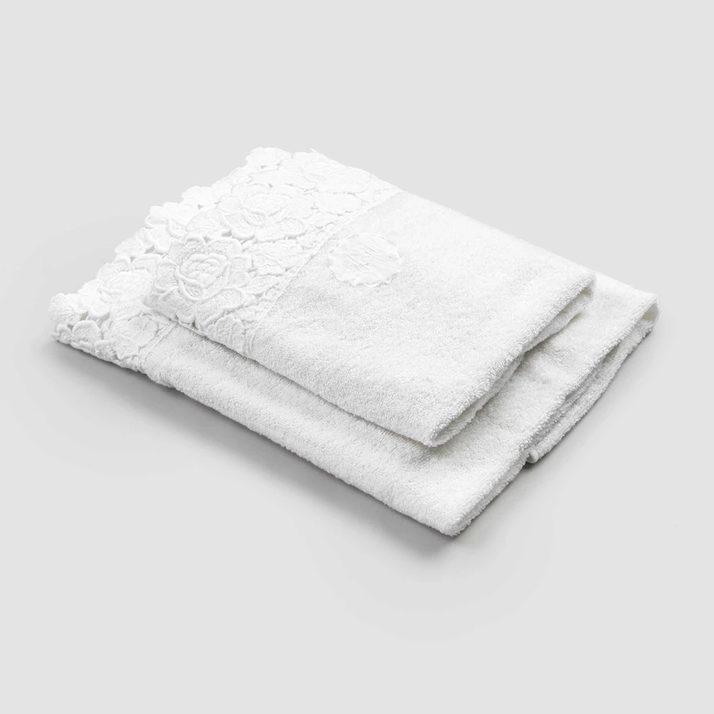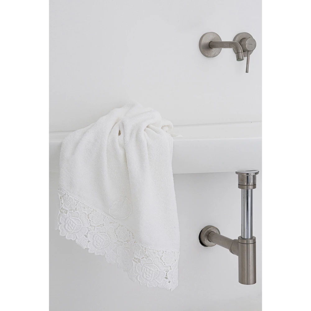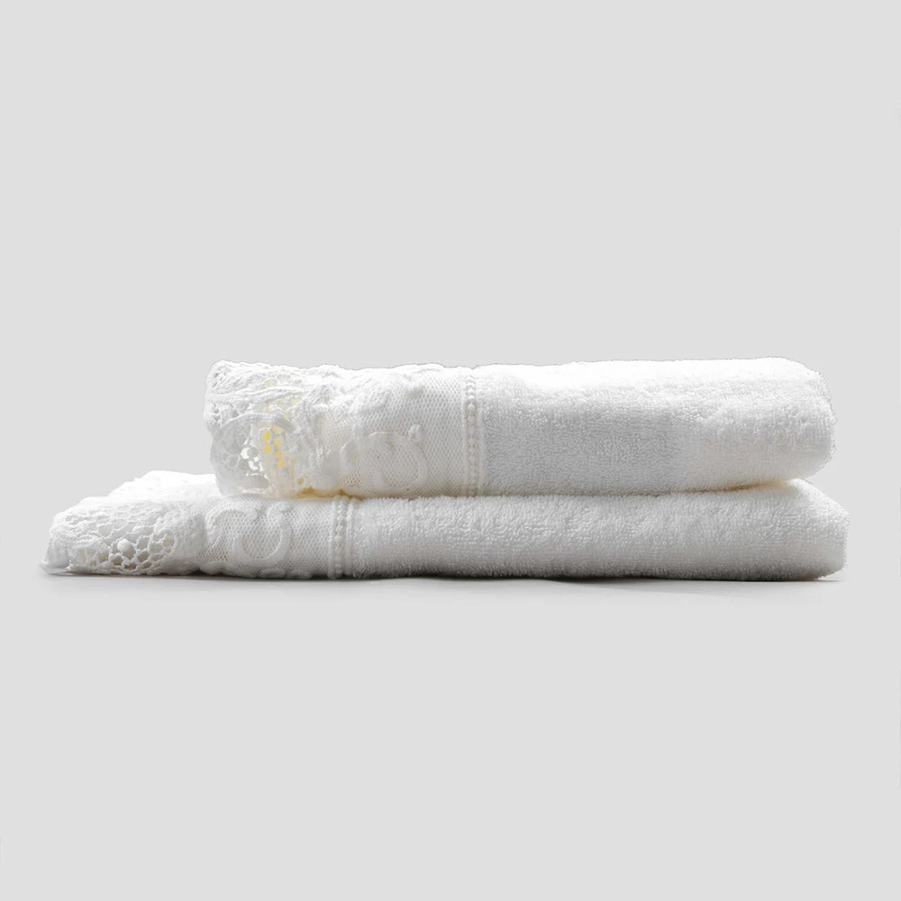 De waarde van traditie wordt gecombineerd met de moderne levensstijl in dit paar witte gezichts- en gastendoekjes van witte katoenen badstof met farnese, tule of met rozenkant aan één kant en een rand van linnenmix .