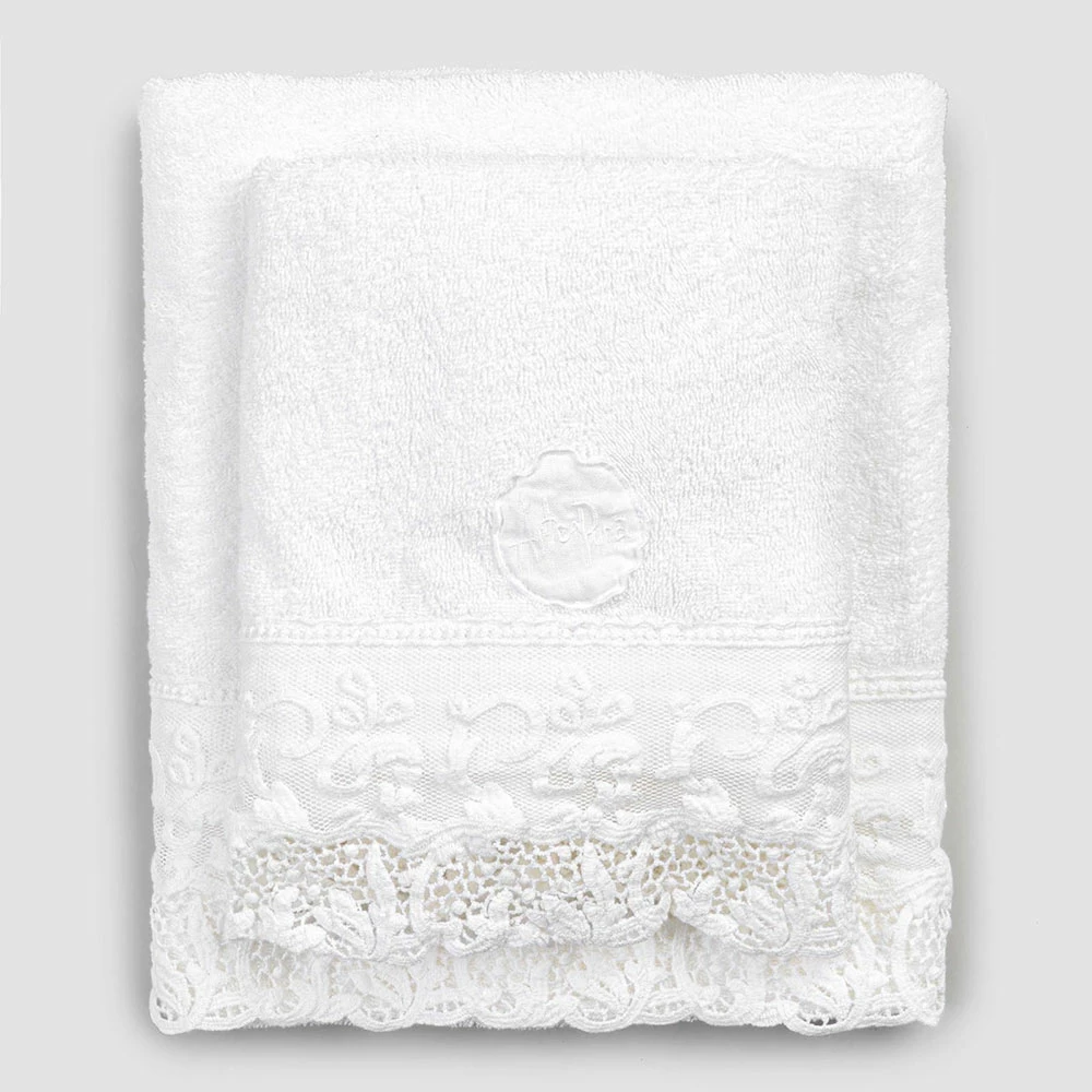 Paar gezichts- en gastendoekjes in wit katoen met kant in variaties en broder in linnenmix, handgemaakte luxe gemaakt in Italië.