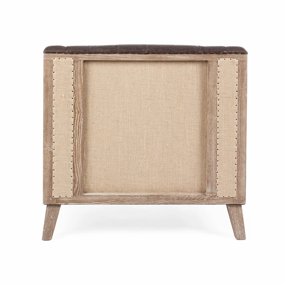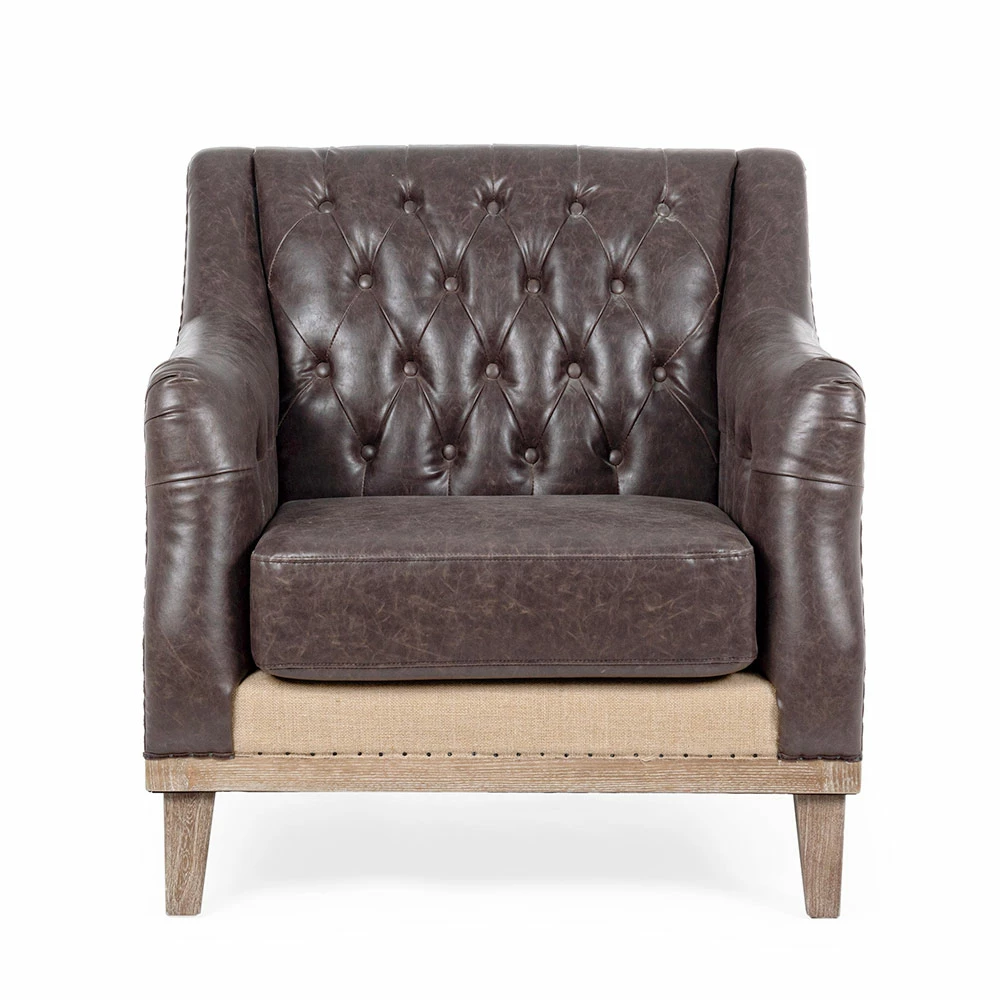 Klassieke design fauteuil met houten poten en kunstleren zitting.