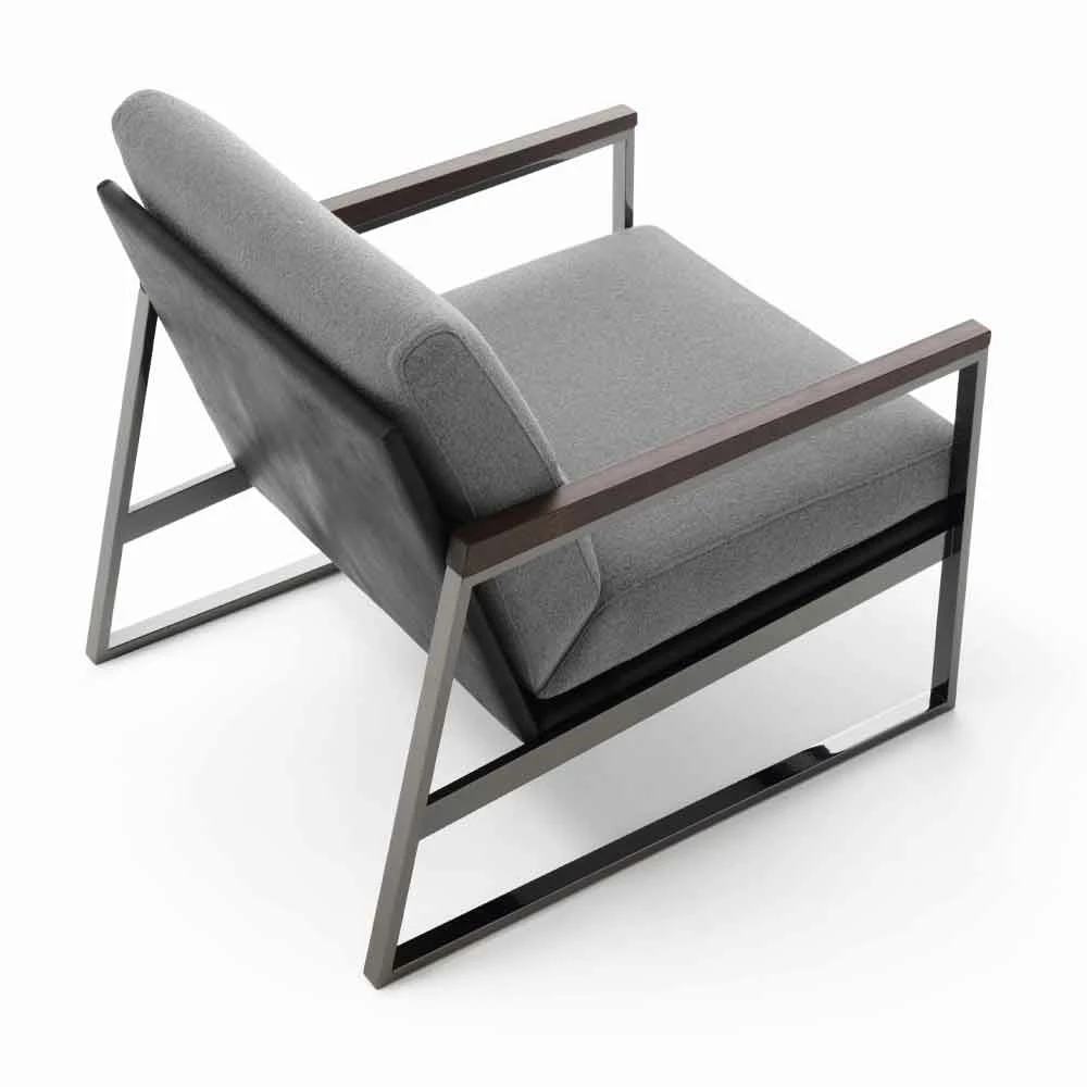 Woonkamer fauteuil gemaakt in Italië met zwart verchroomde metalen structuur verrijkt door de specifieke armleuningen in essenhout en houten schaal opgevuld met onvervormbaar polyurethaanschuim en bedekt met stof (verwijderbaar). Achter- en onderpaneel bekleed met zwart leer (niet afneembaar).