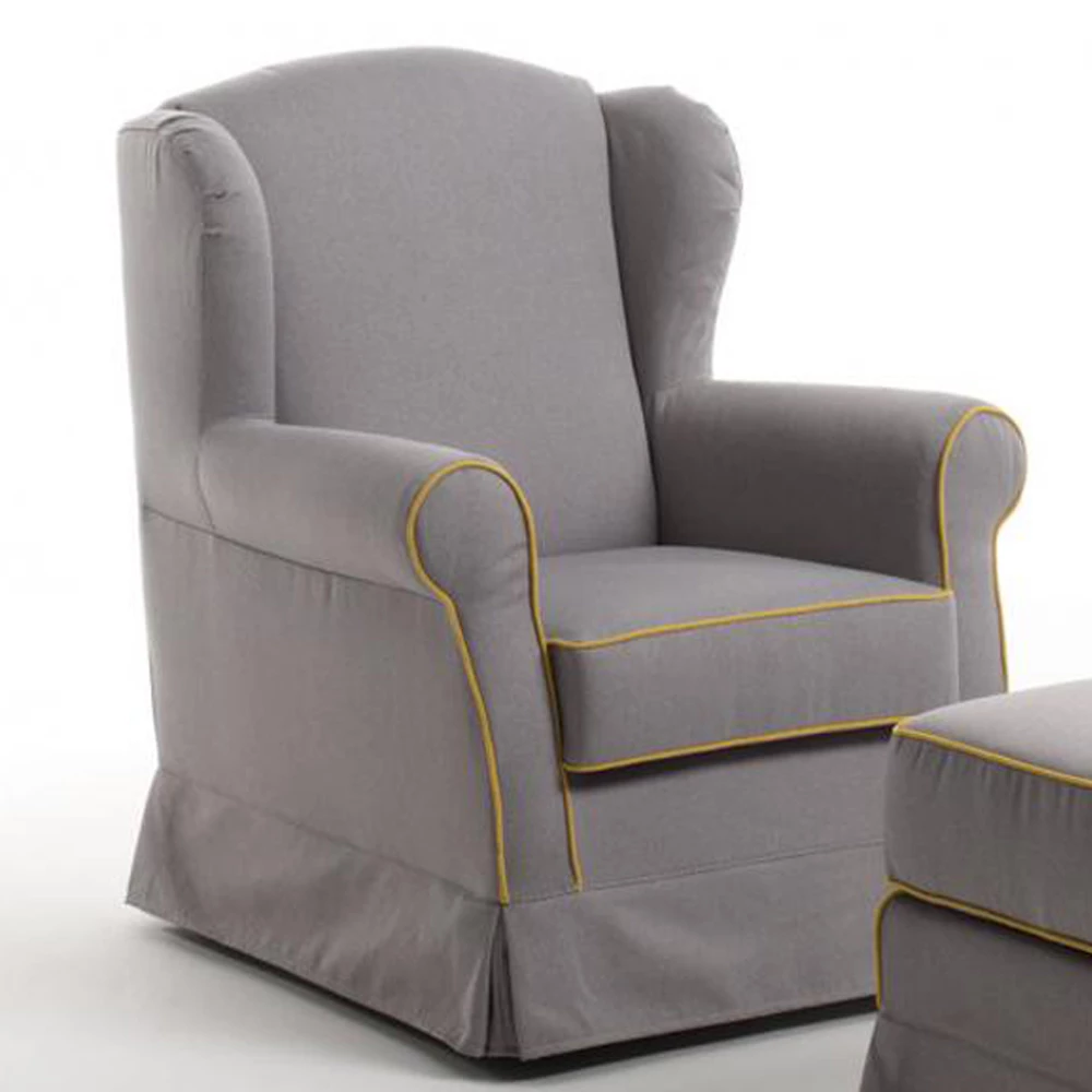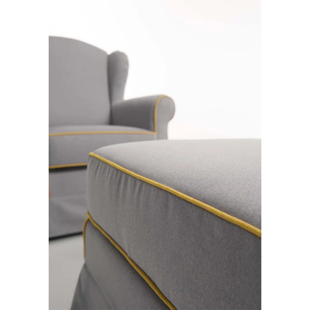 Woonkamer fauteuil in stof met gele rand compleet met poef Made in Italy.