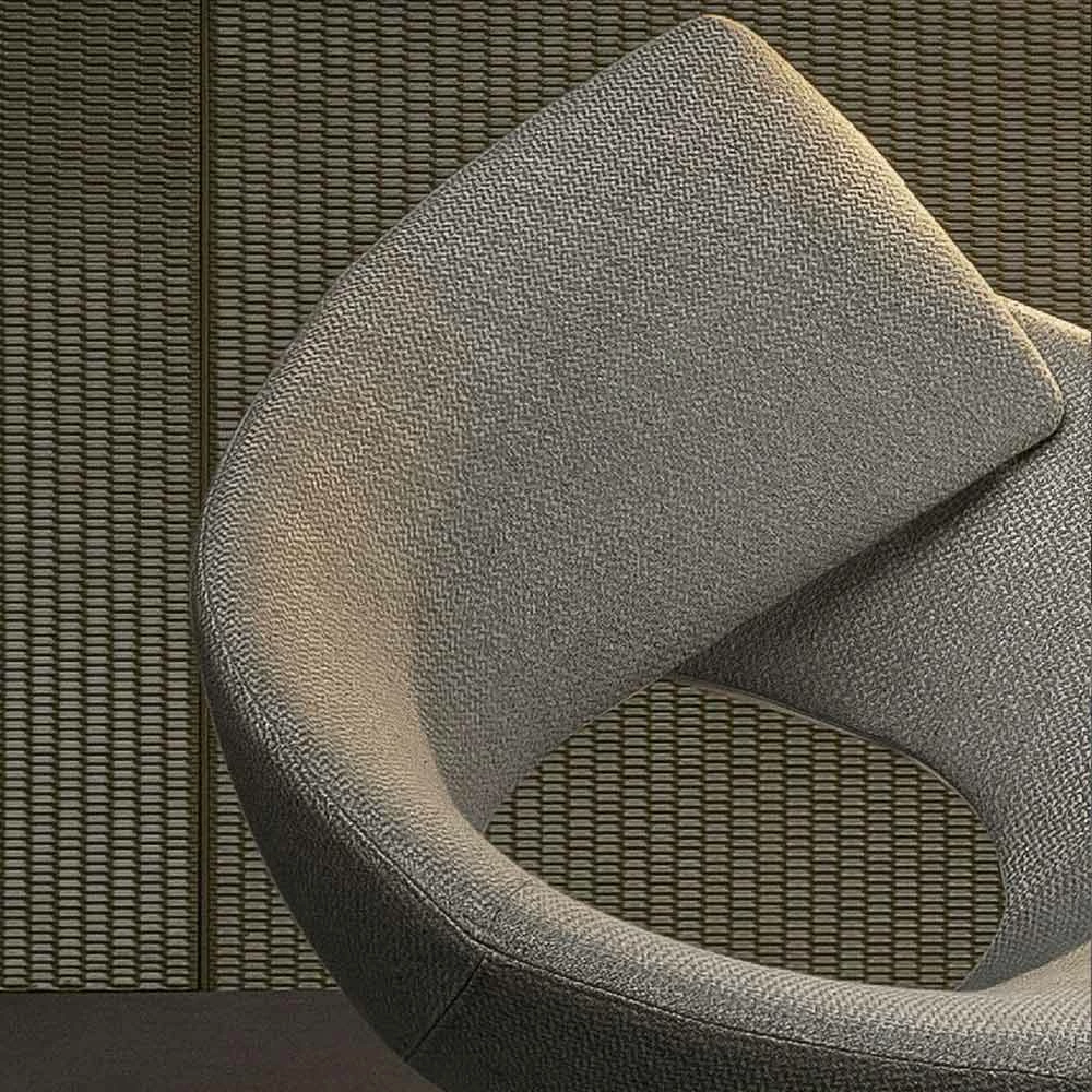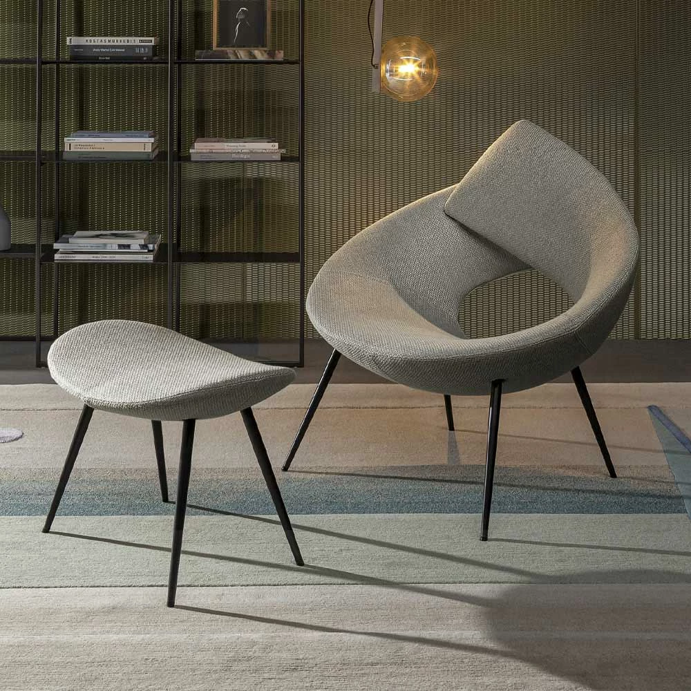 Fauteuil voor woonkamer gemaakt in Italië met externe bekleding in stof en metalen onderstel in loodafwerking, compleet met praktische voetensteun in dezelfde kleur. Een stoel die tegelijkertijd bescherming en comfort uitstraalt door de man in het midden te plaatsen en zich om hem heen te ontwikkelen dankzij een gewatteerde band die zichzelf opvouwt om de rugleuning te vormen. De ronde vorm simuleert een knuffel en roept een gevoel van bescherming op , een element dat een vertrouwde en gastvrije plek onderscheidt, het speciaal maakt, anders dan alle andere. De slanke metalen poten geven de fauteuil lichtheid en balans en zorgen voor een solide, resistente en hoogwaardige zitting.