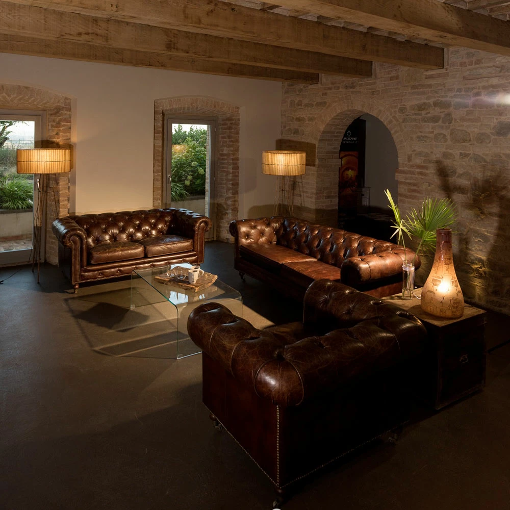 Deze fauteuil maakt deel uit van een collectie die kan pronken met een tijdloze schoonheid en smaak die bestand is tegen de voorbijgaande mode en de suggestie van trends. Stevige en robuuste structuren , gecapitonneerd vakmanschap, handmatig ponsen en spijkeren, bekleding in echt leer (fior di pelle) , bewerkt met een bepaalde looiing, speciaal ontworpen om het leer een vintage, verouderde look te geven. De producten in deze collectie worden gekenmerkt door het verfijnde belang van de vormen en kostbare materialen die ze bezielen. Deze stoelen zijn perfect voor het verfraaien van hoogwaardige inrichtingsomgevingen, die elegantie en karakter tot hun voorrecht maken.