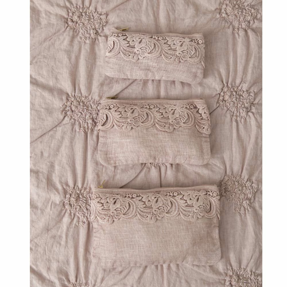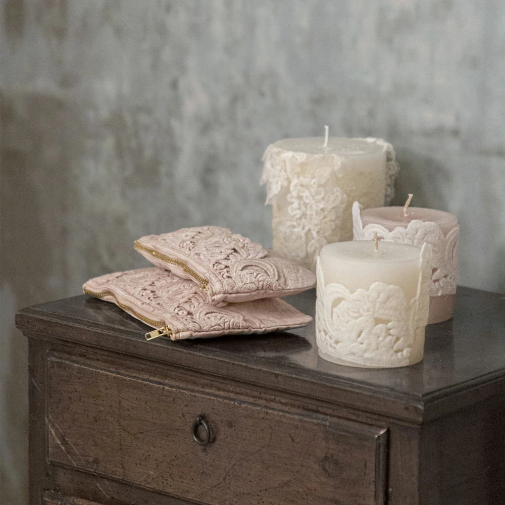 De waarde van traditie voegt zich bij de moderne levensstijl met de linnen koffer in zwart of antiek roze versierd met kant en verkrijgbaar in 3 verschillende maten.